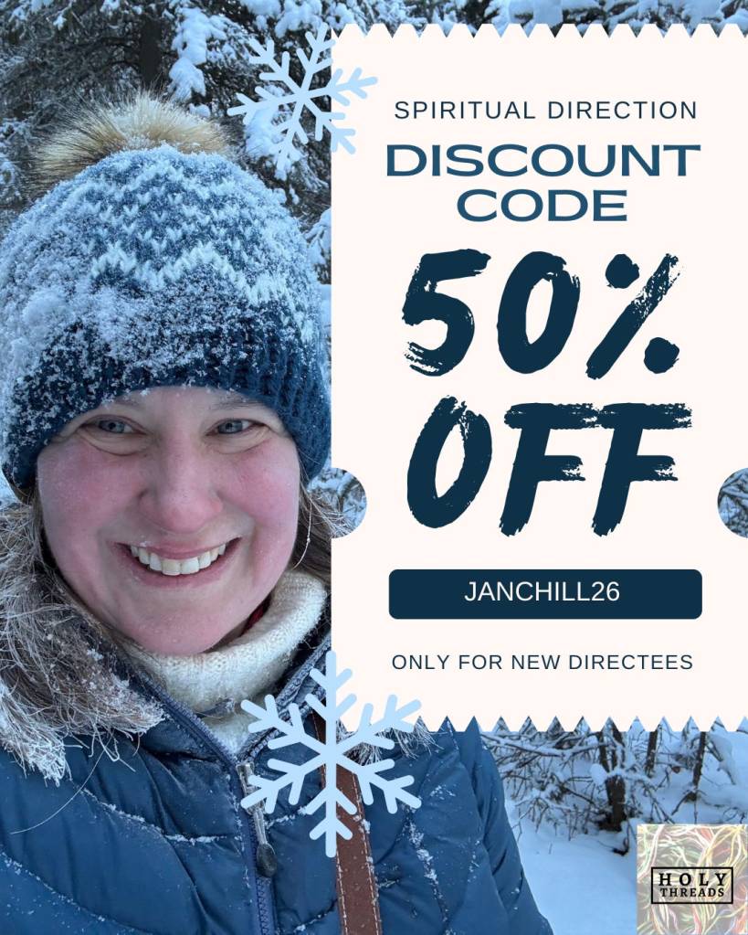 If you are curious about what spiritual direction might be like and might like to give it a try, you can take advantage of this discounted rate with dates available through the end of February. Click on this link to book an hour of spiritual direction and enter the coupon code JANCHILL26 to get a 50% discount on my regular rate.